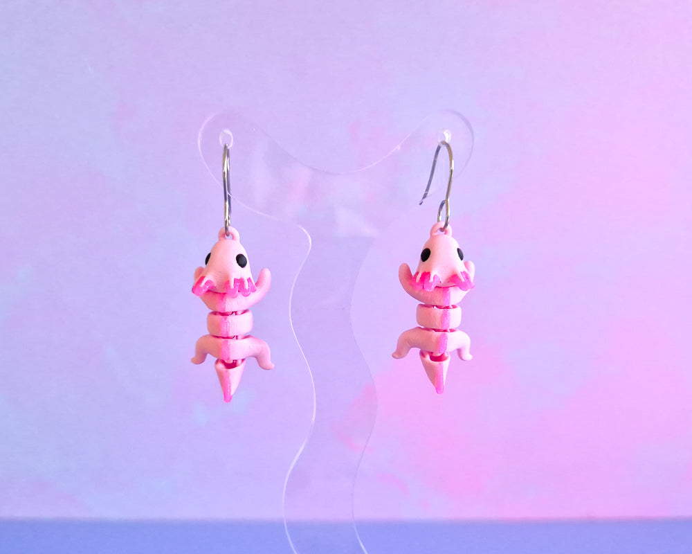 Would you look at that, the axolotls just got TINY and WEARABLE! These lil' dudes are printed scaled farrr down, the moveable parts all move but we don't recommend playing with them beyond showing every person that passes your cute as heck earrings.