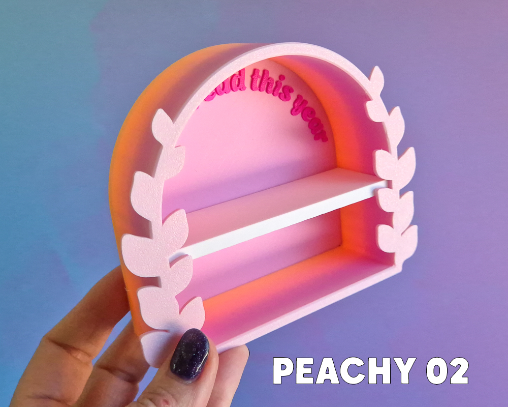 - Peachy 02: Matte baby pink to neon peach gradient with baby pink back & magenta text