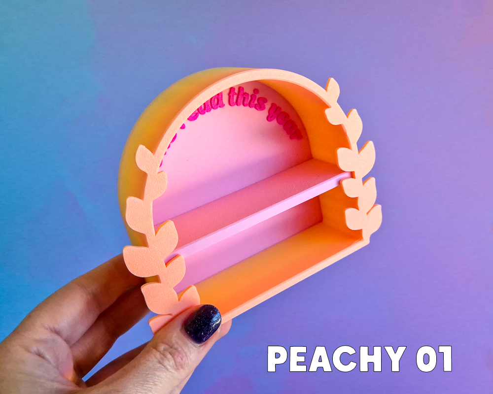 - Peachy 01: Matte peach to yellow gradient with baby pink back & magenta text