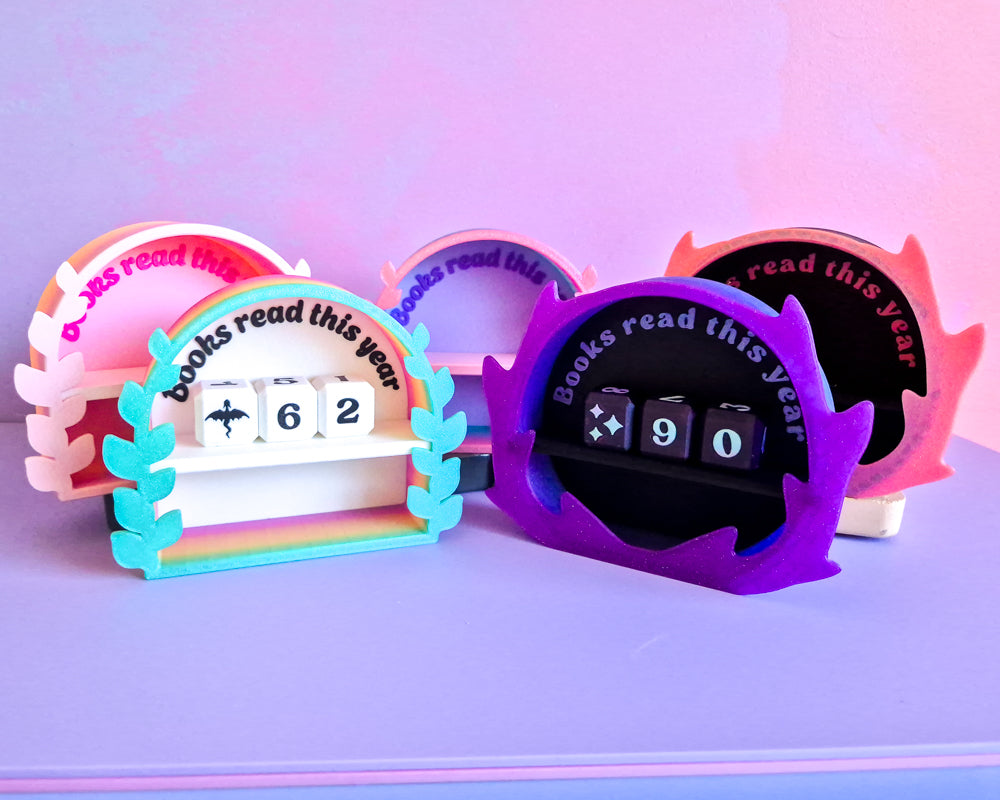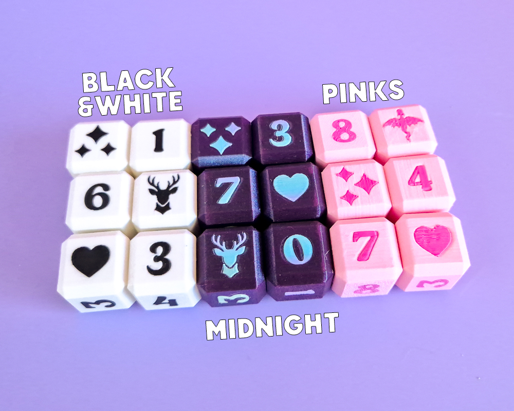 Keep track of your years reading list is the cutest way possible and pair with your choice of dice! Each Book tracker comes with 6 dice, 3 lower (0, 1, 2, 3, 4 + Symbol) & 3 upper (5, 6/9, 7, 8 + 2 Symbols). Symbols are Stars, Stag, Dragon & Heart (2 of each).