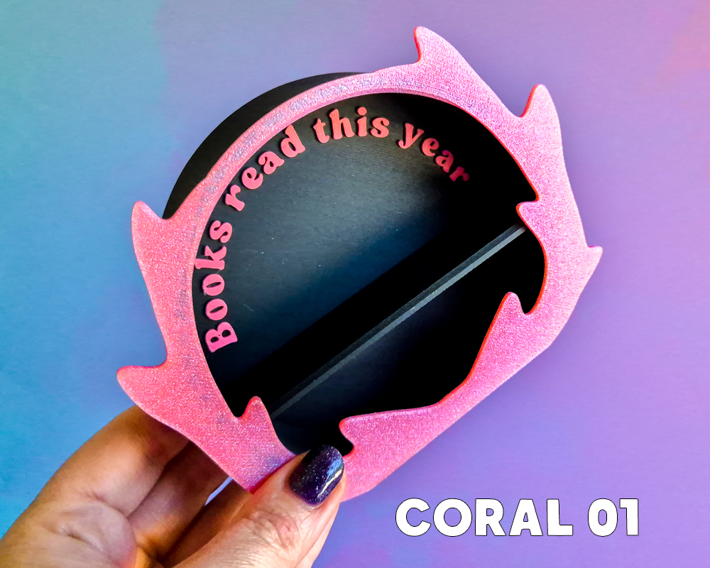 - Coral 01: Sparkling Coral front with matte black back & coral text