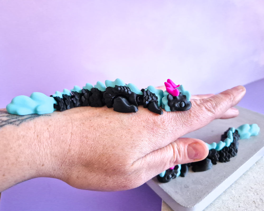 These Small Dragons are a black sparkles with aqua accents.