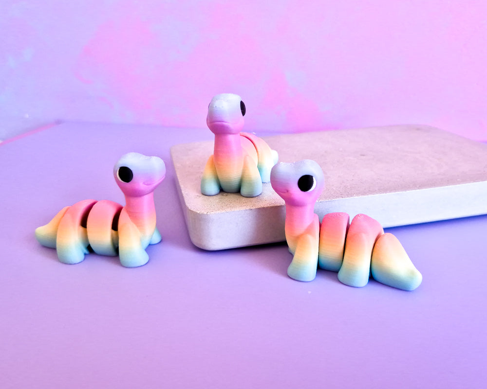 Apatosaurus (Little Foot!) are all approx 6cm long & are a single piece with flexible parts.
