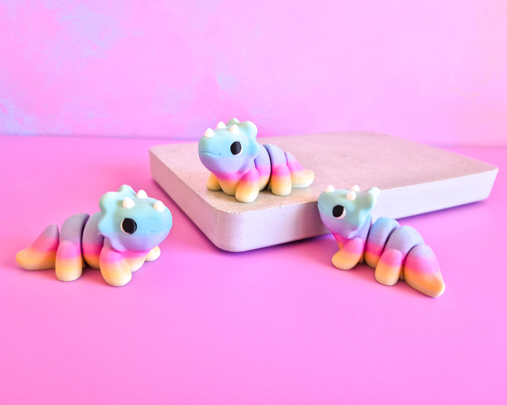 Triceratops, the huffiest Cera's, are all approx 6cm long & are a single piece with flexible parts.