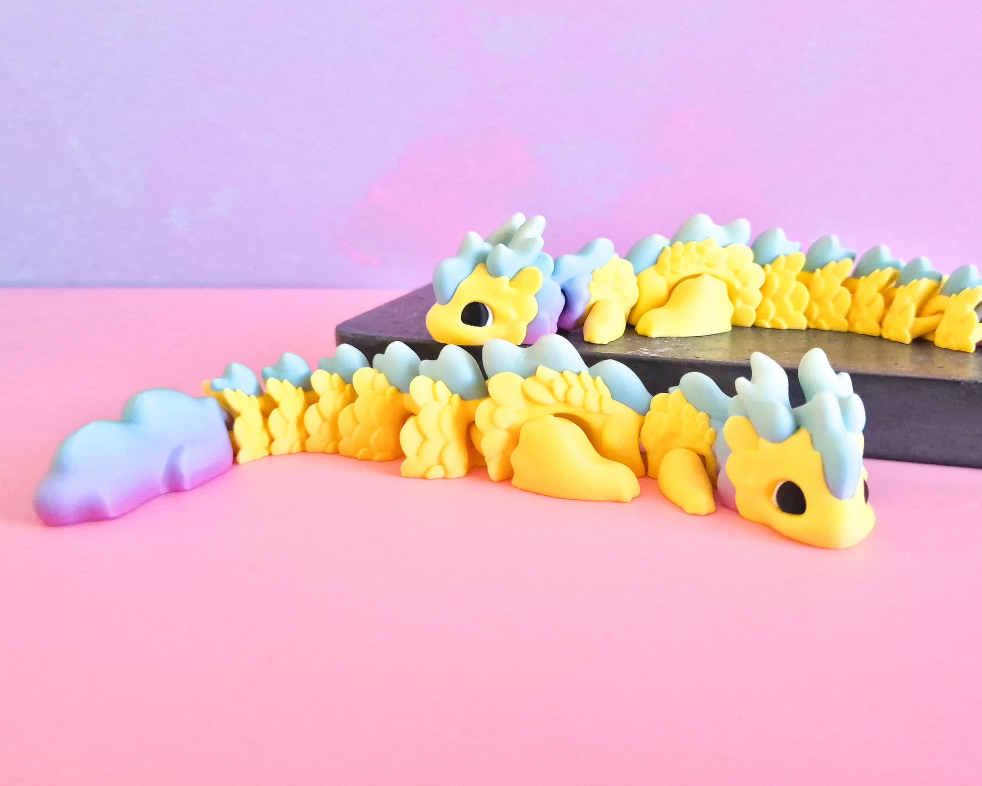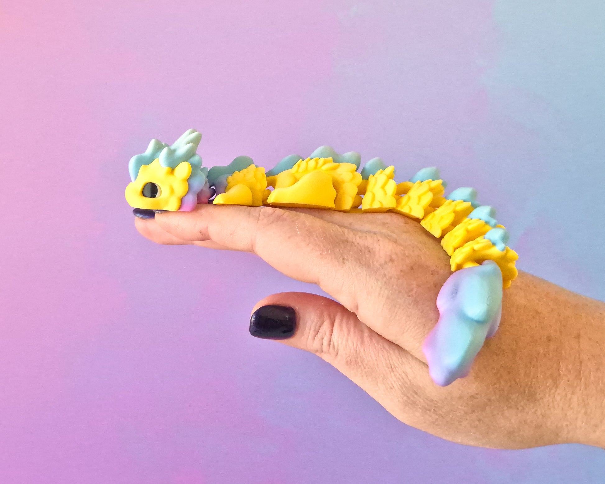These Medium Dragons are a sunny yellow with pastel rainbow accents.