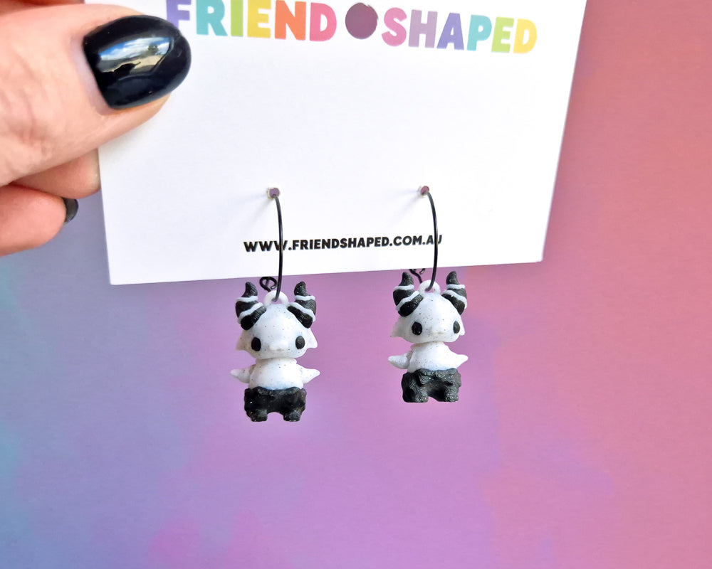 Would you look at that, the beastys just got TINY and WEARABLE! These lil' dudes are printed scaled farrr down, the moveable parts all move but we don't recommend playing with them beyond showing every person that passes your cute as heck earrings.