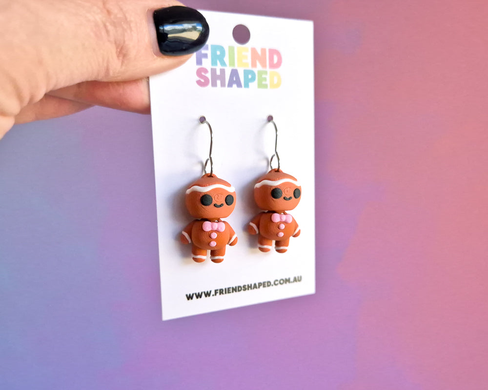 Would you look at that, gingerbread just got TINY and WEARABLE! These lil' dudes are printed scaled farrr down, we recommend showing every person that passes your cute as heck earrings.
