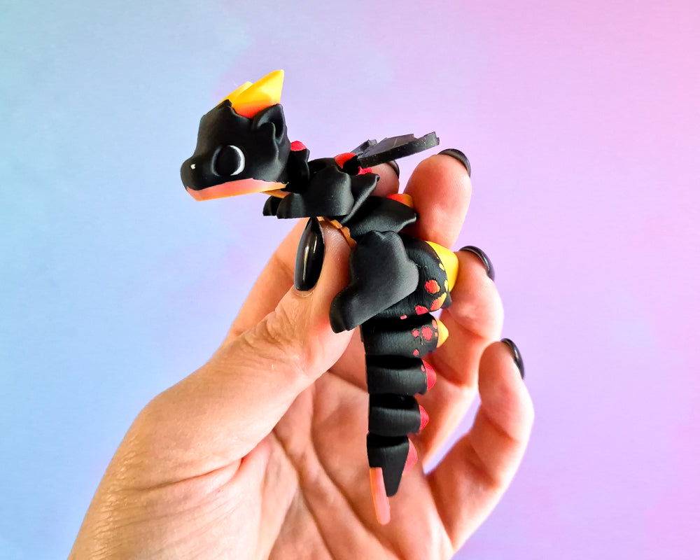 These Small Dragons are black with a fiery gradient accent. They're chunky with heat moulded & ball jointed wings!