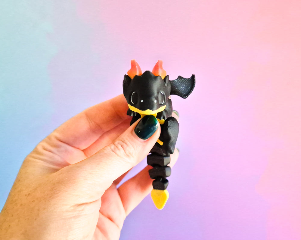 These Small Dragons are black with a fiery sparkley gradient accent. They're chunky with heat moulded & ball jointed wings!